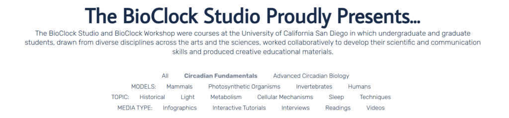 The BioClock Studio and BioClock Workshop were created by Dr. Susan Golden at the University of California, San Diego. In 2015, she was awarded a Howard Hughes Medical Institute Professor award for her innovative idea to create a course where undergraduates from a range of disciplines would create classroom materials for undergraduates learning about Circadian Biology. The course ran for five years as the undergraduate BioClock Studio (’15, ’16, ’17, ’19, ’20), and for two years as the Master’s level BioClock Workshop (’21, ’22).